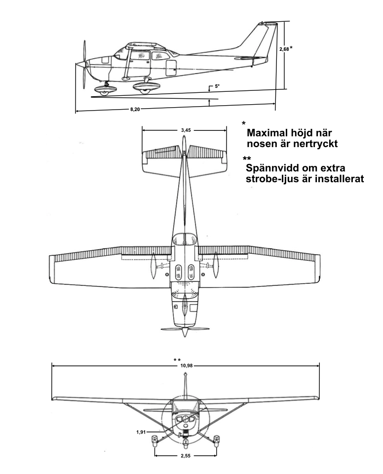 Se bild. Samtliga mått i meter. Vissa mått kan ändras om flygplanet förses med annan propeller, skidor, flottörer eller annan utrustning.