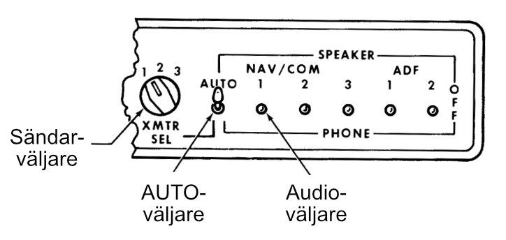 Sändarväljaren (XMTR SEL) väljer sändare (nr 1, 2 eller 3) till mikrofonen. Förstärkaren i denna sändare används då som högtalarförstärkare för all radioutrustning. Skulle denna förstärkare gå sönder måste man välja en annan sändare för att fortsatt kunna lyssna på högtalaren. För avlyssning med hörtelefon behövs ingen förstärkare och dom olika audioväljarna (NAV/COM, ADF) har tre lägen. Mittläget är ett från-(OFF)läge. Uppåt kopplas vald signal till högtalaren (SPEAKER), neråt till hörtelefonen (PHONE). Med AUTO-väljaren i SPEAKER- eller PHONE-läge kopplas NAV/COM-mottagaren med samma siffra, som sändarväljaren (XMTR SEL) står på, automatiskt in på högtalare (SPEAKER) eller hörtelefon (PHONE).