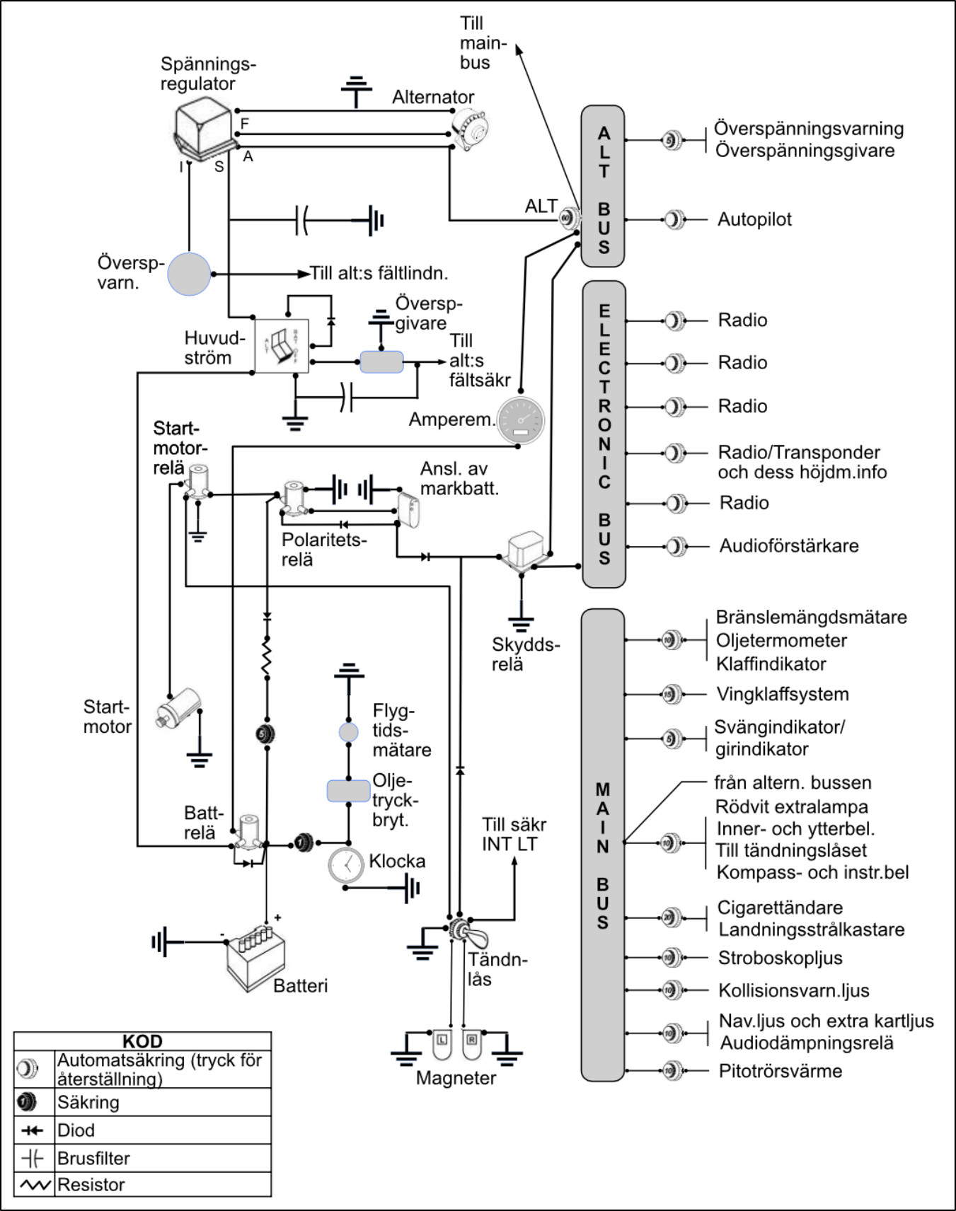 Till en del är elektronisk utrustning (radioutrustning) ansluten, till en annan del är övriga strömförbrukare (belysning, klaffar etc) anslutna utom huvudströmställare och autopilot, som är anslutna till skenans tredje del. Samtliga tre delar är alltid strömförande, utom när startmotorn är inkopplad eller då en markströmkälla är ansluten. I dessa fall kopplar ett relä automatiskt bort den elektroniska delen med radioutrustning som därmed skyddas från skadliga spännings-ändringar.