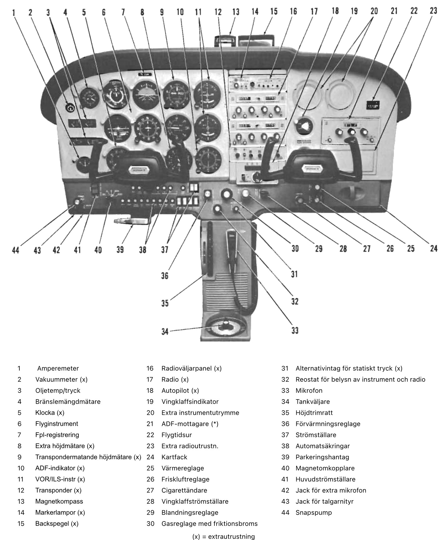 Flyginstrumenten är placerade i en vibrationsdämpad panel framför vänstra förarplatsen, motorinstrument, vakuummeter