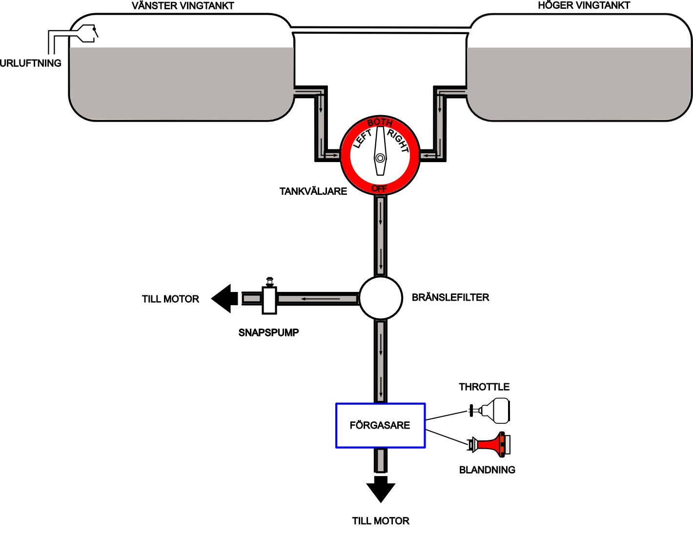 Mätarna är placerade på vänster instrumentbräda. Från tankarna rinner bränslet till en fyrläges tankväljare. Tankväljaren är placerad i mitten nedanför instrumentpanelen och har lägena: LEFT, BOTH, RIGHT Och OFF (vänster, båda, höger och från). Vid start och landning ska den alltid stå i läge BOTH. Från tankväljaren rinner bränslet till förgasaren.