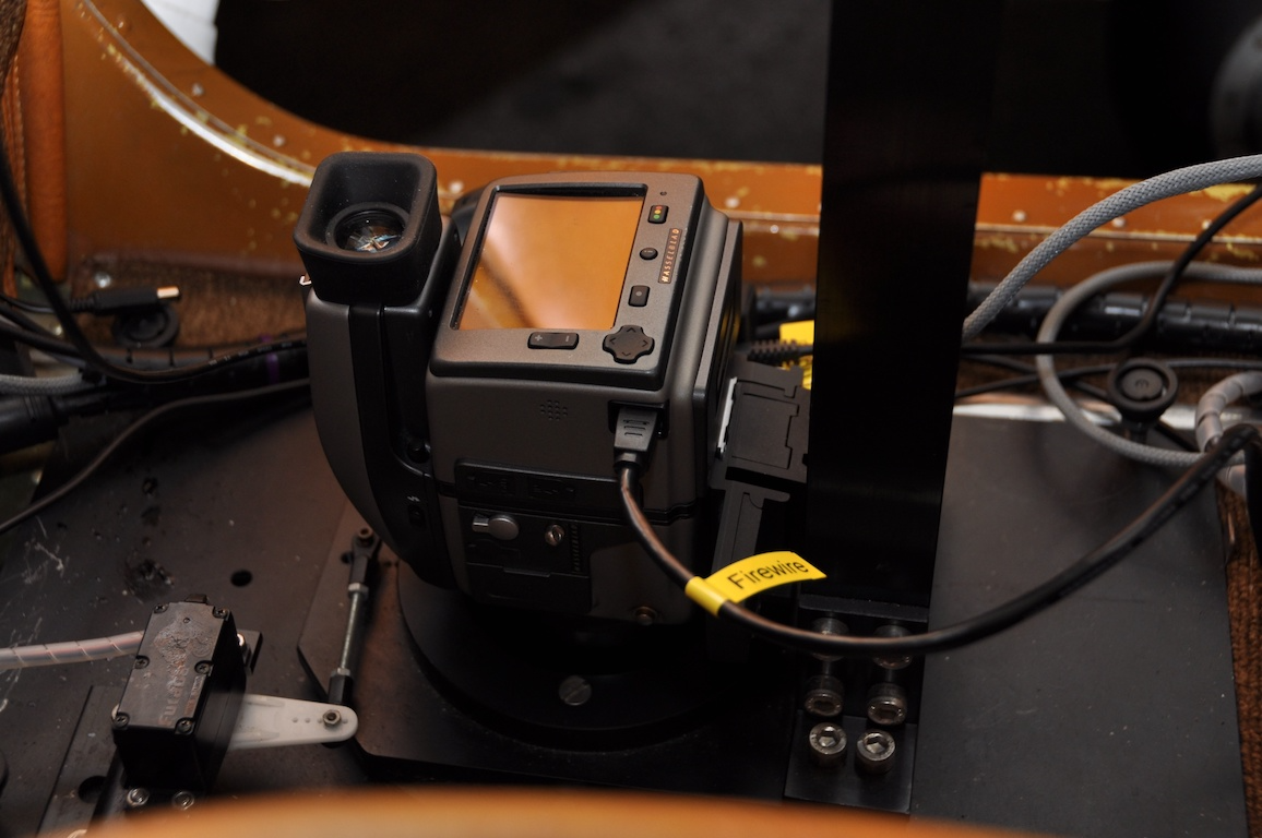 Ett servo är monterad på stativets bottenplatta och kan via ett vred ändra läget på plattan och därmed kameran i girplanet.